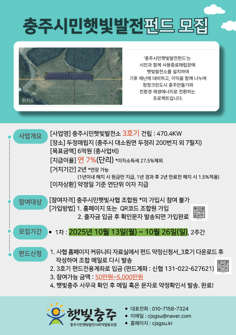 공지 충주시민햇빛발전펀드(3호기) 모집 공고 작성자 관리자 등록일자 2025년 10월 13일 16시 36분 39초 조회 219 3호기펀드모집_웹용.jpg [ Size : 232.99KB, Down : 167 ] 미리보기 다운로드 목록보기