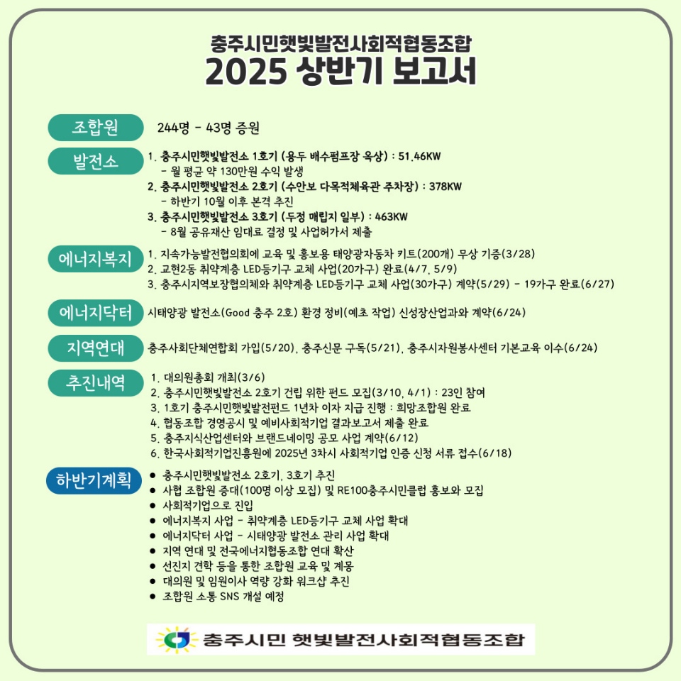 2025년도 상반기 현황보고 작성자 관리자 등록일자 2025년 7월 31일 15시 28분 13초 조회 391 충주시민햇빛발전사회적협동조합의 2025년도 상반기현황보고입니다 2025상반기보고.jpeg [ Size : 271.76KB, Down : 174 ] 미리보기 다운로드 목록보기